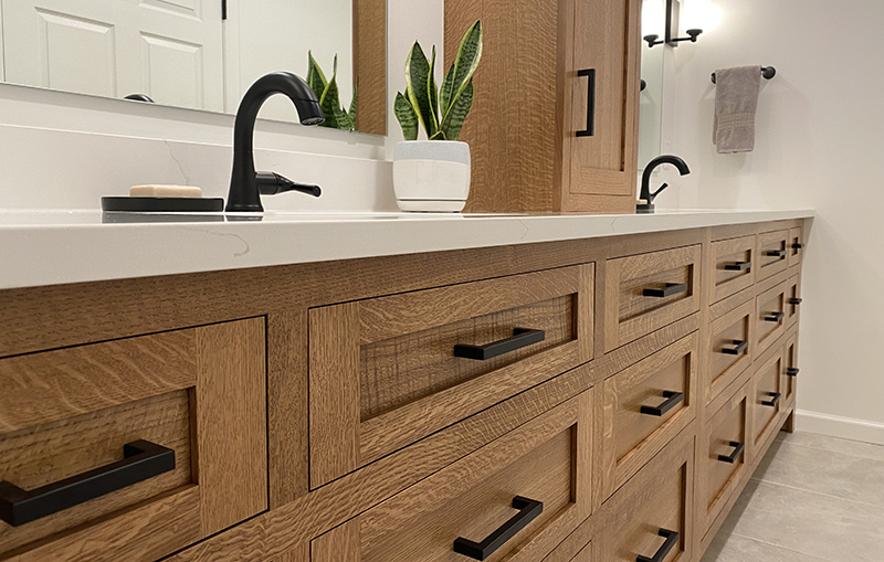 White Oak is a dense and hard wood so it is ideal for cabinetry that sees a lot of daily use, especially kitchens and bathrooms. White Oak resists dents, scratches, and wears much better than softer species like pine or alder. Because of its closed-cell structure, it’s rot- and moisture-resistant and less prone to warping or swelling with humidity changes. Quarter-sawn White Oak in particular is extremely stable and much less prone to cupping/warping/twisting than other woods or plain-sawn White Oak due to the way it is cut in relation to the direction of the grain.